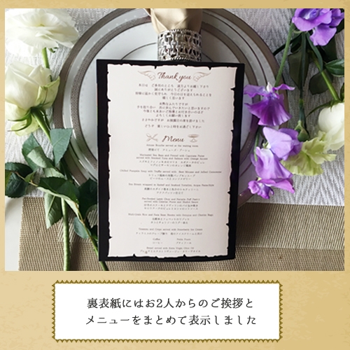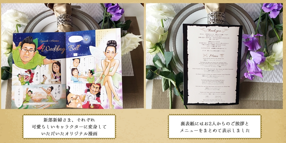 細かい決まりが無く、自分達でプロフィールの文章を作る事ができましたし、漫画のストーリーや絵の雰囲気、文字の字体やあらゆる細かい事すべてに私達の意見を取り入れて作品作りに反映してくださいました。お陰様で、他の式では見た事の無いオリジナルの冊子ができ、周りからも好評でした!すべて1冊にまとまっているので、受け取った方も「メニューはどこだ?」「プロフィールはどこにしまったっけ?」と てんやわんやせずにスマートにすんだそうです。